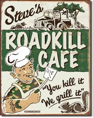 • Metalowy szyld plakat reklamowy blacha tin sign USA Roadkill Cafe u Steva. Ty zabijasz my grillujemy Prezent