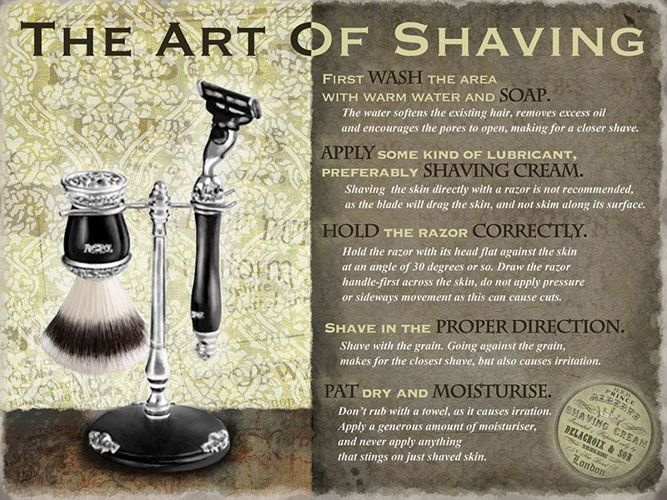 • Metalowy plakat zawierający stara instrukcję porannego golenia.